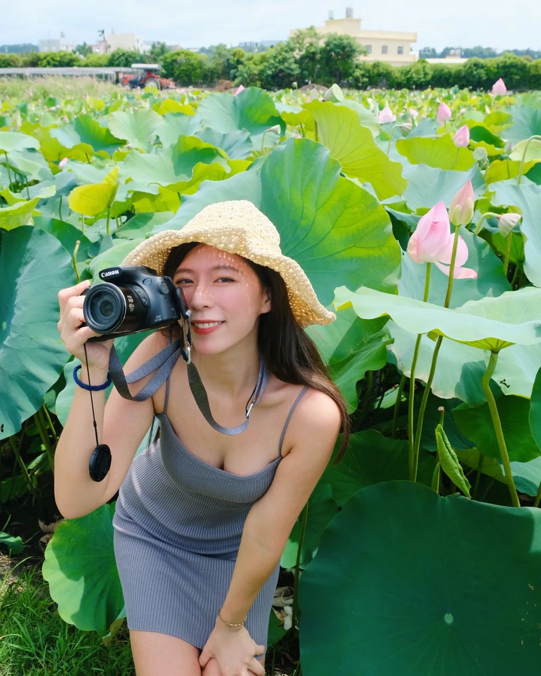 一年一季的荷花季就是需要這款代言才能強力推廣啊!眼前這位戴著草帽的妹子就是【軟軟Yuki】,萬綠叢中的粉色荷花還是不敵這味笑容甜美的清新女孩,穿著灰色細肩帶小洋裝,嶄露那甜而不膩的高顏值,讓人瞬間戀愛,拿起單眼想記錄這片荷花甜的她,也讓人想反紀錄下這難得一見的正妹!